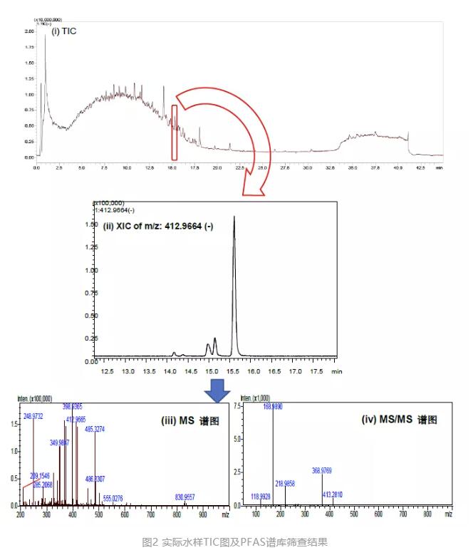 將地表水樣品濃縮50倍后直接進(jìn)樣分析,利用質(zhì)譜庫匹配保留時(shí)間、MS、MS/MS圖譜,在其中篩查到了PFOA,MS和MS/MS質(zhì)譜的相似度分別為96%和92%,質(zhì)量誤差0.18ppm(圖2)。