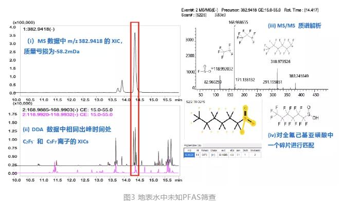 PFAS可以產(chǎn)生氟代基團(tuán)碎片官能團(tuán)具有特征的斷裂模式,通過具有高度特異性的碎片可以作為診斷離子,在MS/MS質(zhì)譜中尋找疑似PFAS污染物。
