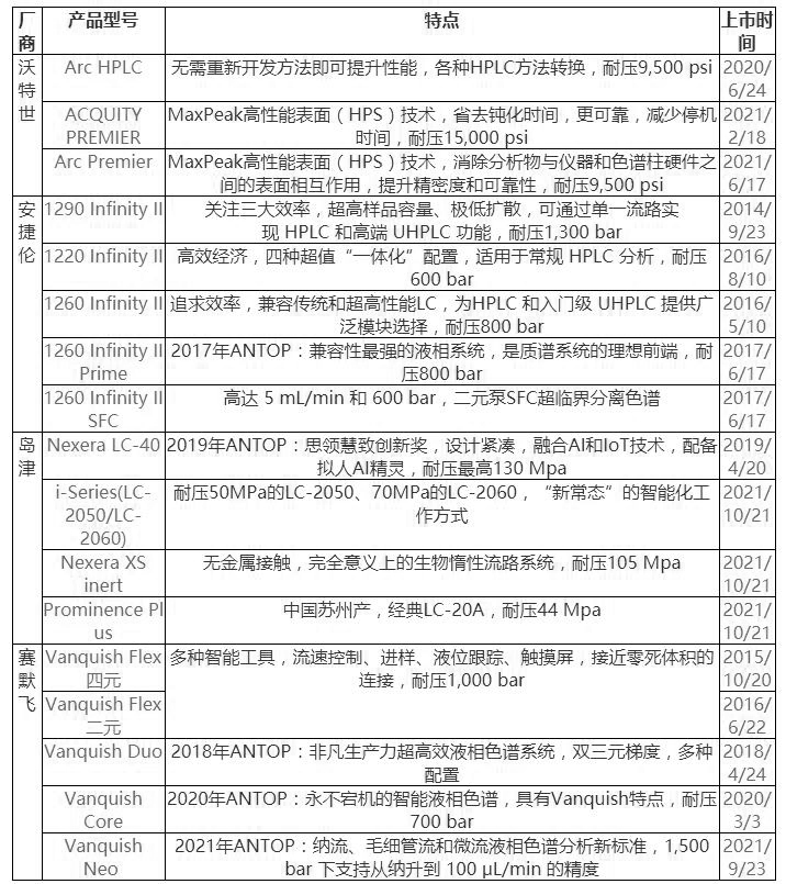 由于“UPLC”這個詞匯被沃特世專利,競爭者們均采用UHPLC,并推出很多概念。2015年沃特世發布ACQUITY Arc HPLC/UHPLC系統,作為“橋梁”的Arc將高效液相色譜重新區分為HPLC、入門級UHPLC和高端UHPLC/UPLC。2018年,沃特世發布4款產品:生物惰性的ACQUITY Arc Bio、ACQUITY H-Class Bio、ACQUITY H-Class PLUS(四元)和ACQUITY I-Class PLUS,2019年發布ACQUITY H-Class PLUS binary二元系統。2020年Waters推出了Arc HPLC新一代HPLC,2021年推出帶有MaxPeak技術的ArcPremier和ACQUITY Premier。