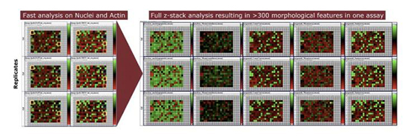 HCS采用高分辨率的熒光數(shù)碼影像系統(tǒng),可以獲得被篩樣品對(duì)細(xì)胞產(chǎn)生的多維立體和實(shí)時(shí)快速的生物效應(yīng)信息,在細(xì)胞水平上檢測(cè)多個(gè)指標(biāo)的多元化,功能性篩選。與基于讀板儀(酶標(biāo)儀)的傳統(tǒng)HTS相比,HCS被認(rèn)為更具可預(yù)測(cè)性,因?yàn)楦邇?nèi)涵成像(HCI)篩選法可顯示細(xì)胞對(duì)化合物反應(yīng)的表型數(shù)據(jù),而其可能同一個(gè)實(shí)驗(yàn)中的在靶效應(yīng)和/或脫靶效應(yīng)有關(guān)。盡管在實(shí)驗(yàn)的規(guī)劃階段必須考慮可能出現(xiàn)的實(shí)驗(yàn)噪聲、工作流挑戰(zhàn)和數(shù)據(jù)存儲(chǔ)容量,但通過使用多路復(fù)用技術(shù),可以監(jiān)控多個(gè)終點(diǎn)。
