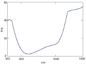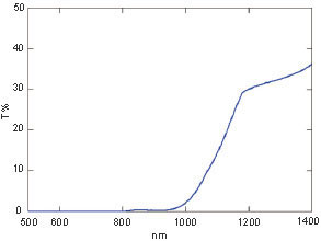 此圖是多晶硅樣品的透過率譜圖,由于系統具有測定到1400nm的能力,顯示了帶隙區域(1000nm附近)的透過率特征。
