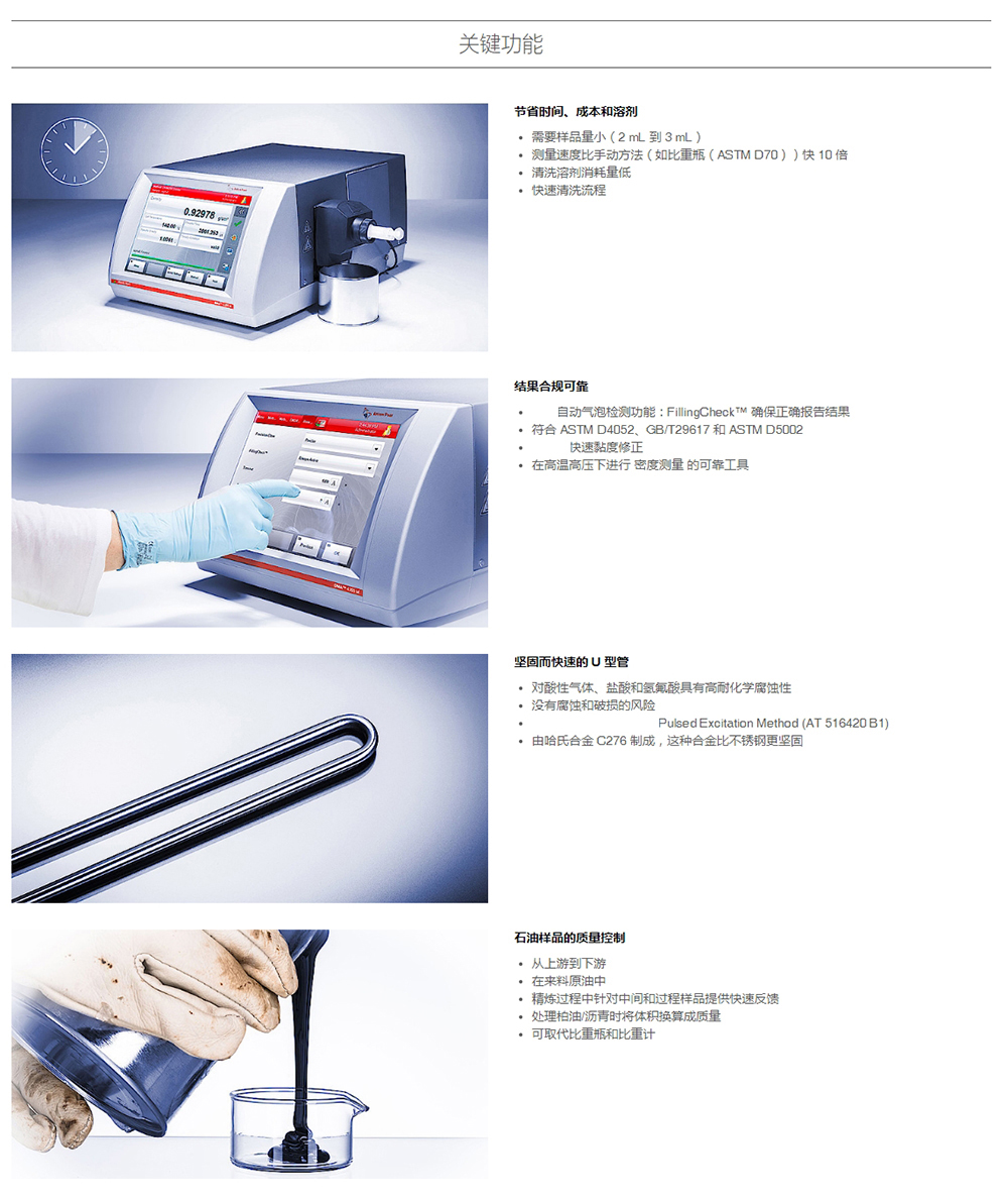 DMA 4200 M 是一款適用于特殊條件的密度計。它可在 -10°C 到 200°C 的溫度范圍內和 500bar的高壓下測量密度。DMA 4200 M 使用的 Pulsed Excitation Method 基于對振蕩特性的全面了解,可提供穩定的密度結果。自動氣泡檢測 FillingCheck功能使 DMA 4200 M 符合 ASTM D4052、GB/T29617 和 ASTM D5002 標準。通過快速全新黏度修正來消除黏度影響,從而確保密度結果準確度高達 0.0002 g/cm3。利用 DMA 4200 M的 Temperfect功能,可以在大氣壓力下在 0°C 到 150°C 之間的任何溫度下即刻測量密度。 DMA 4200 M 可改善、加速并簡化重質石油樣品的密度測量。